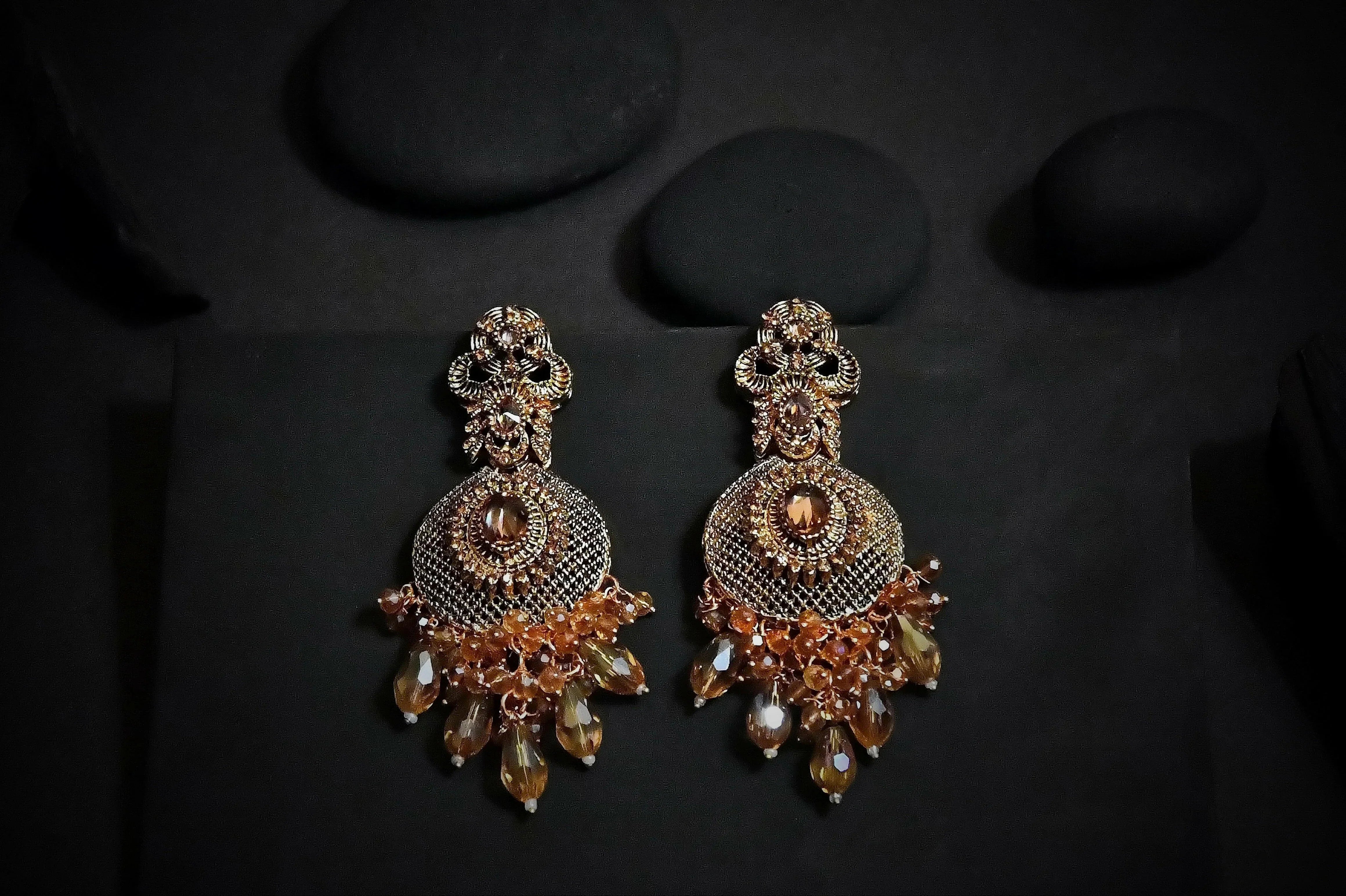 Amber Luxe Jhumka – A fusion of regal charm and intricate craftsmanship. These antique gold-plated earrings showcase a mesmerizing filigree design, adorned with amber-hued stones and delicate bead droplets that exude elegance and heritage glamour. The classic jhumka silhouette seamlessly complements both traditional and contemporary outfits, making them an exquisite choice for weddings, festive occasions, or sophisticated soirées.