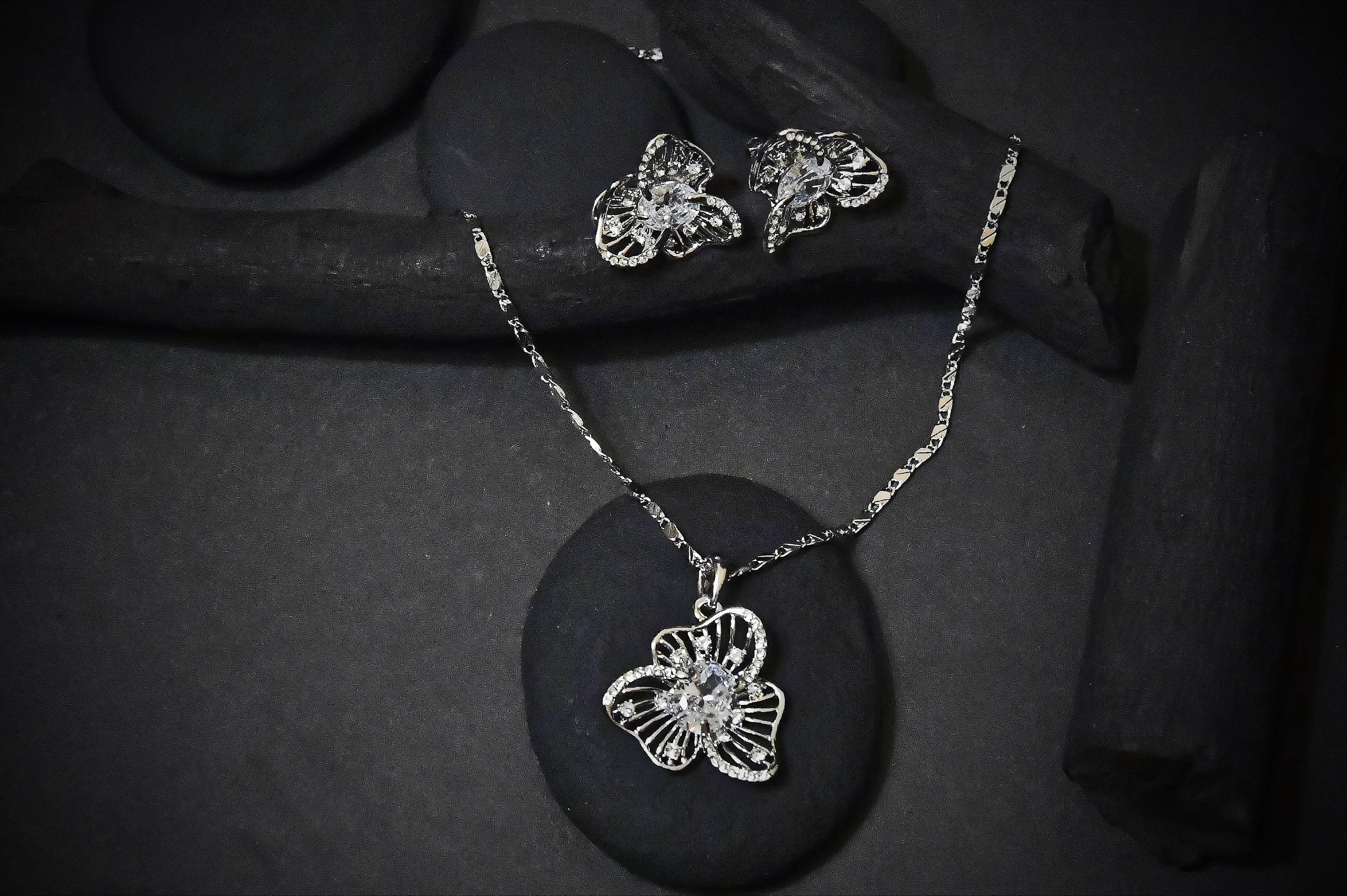 Floral Radiance Pendant Set – A captivating blend of elegance and nature-inspired beauty. This breathtaking jewelry ensemble features a shimmering flower-shaped pendant and matching stud earrings, adorned with dazzling cubic zirconia set in an intricate silver-tone frame. Designed to add a touch of femininity and sophistication, this versatile set effortlessly complements both casual and formal looks.