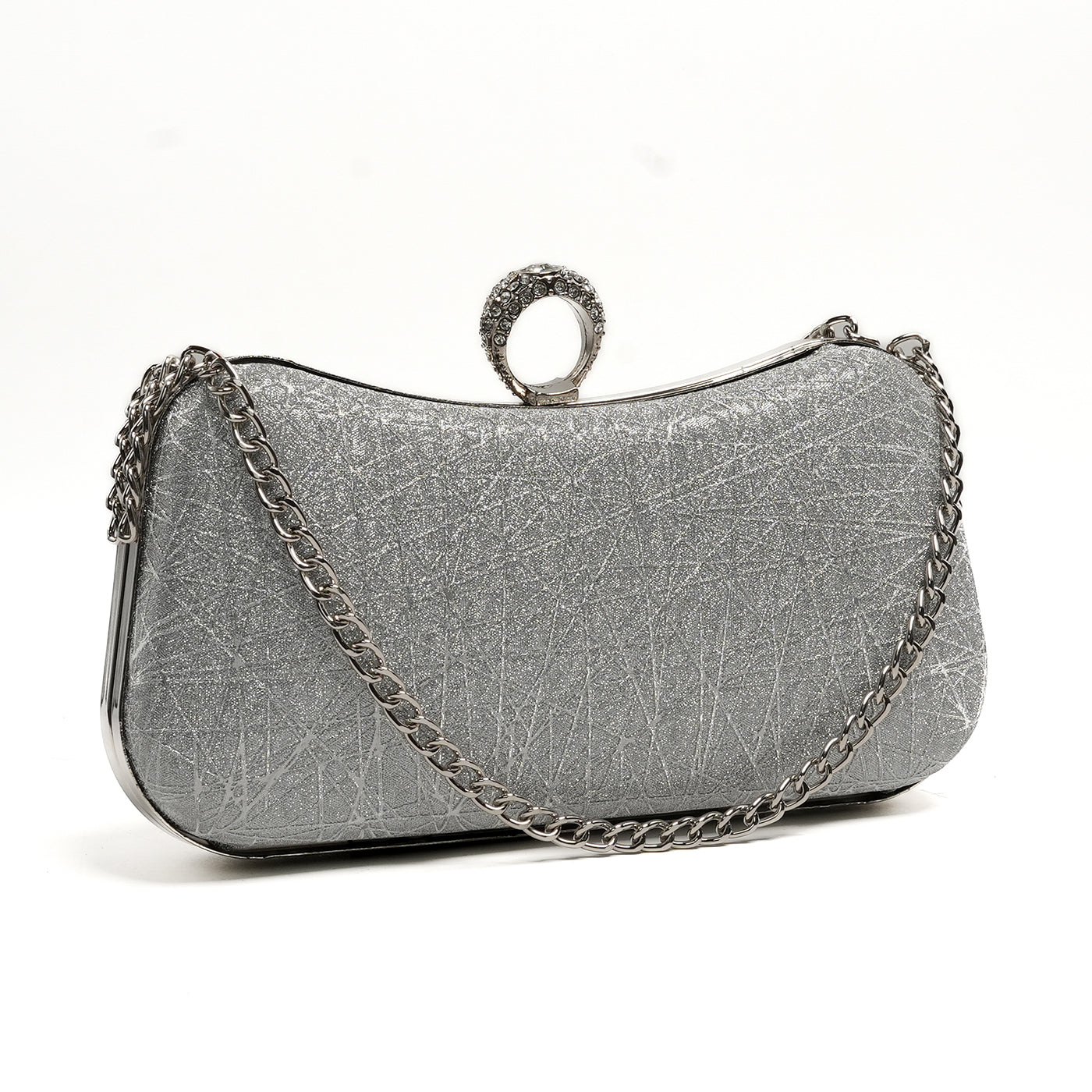 A chic, semi-structured clutch with a shimmering textured surface. Features an elegant double-ring crystal buckle that adds a sophisticated, high-end look. The sleek silhouette makes it ideal for formal events, parties, and special occasions.